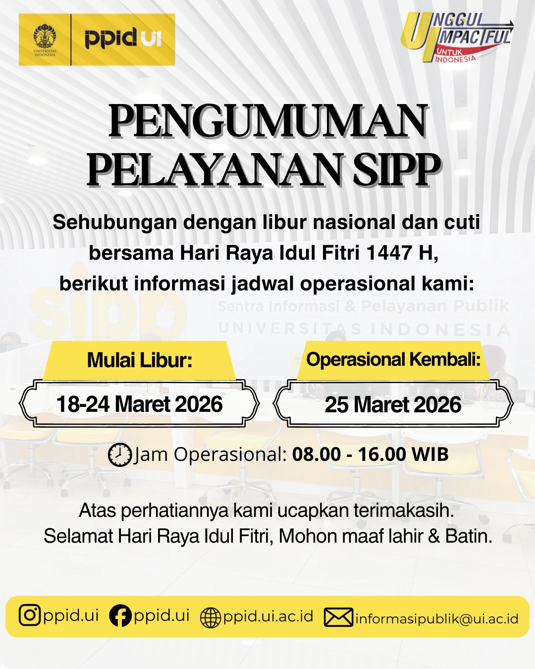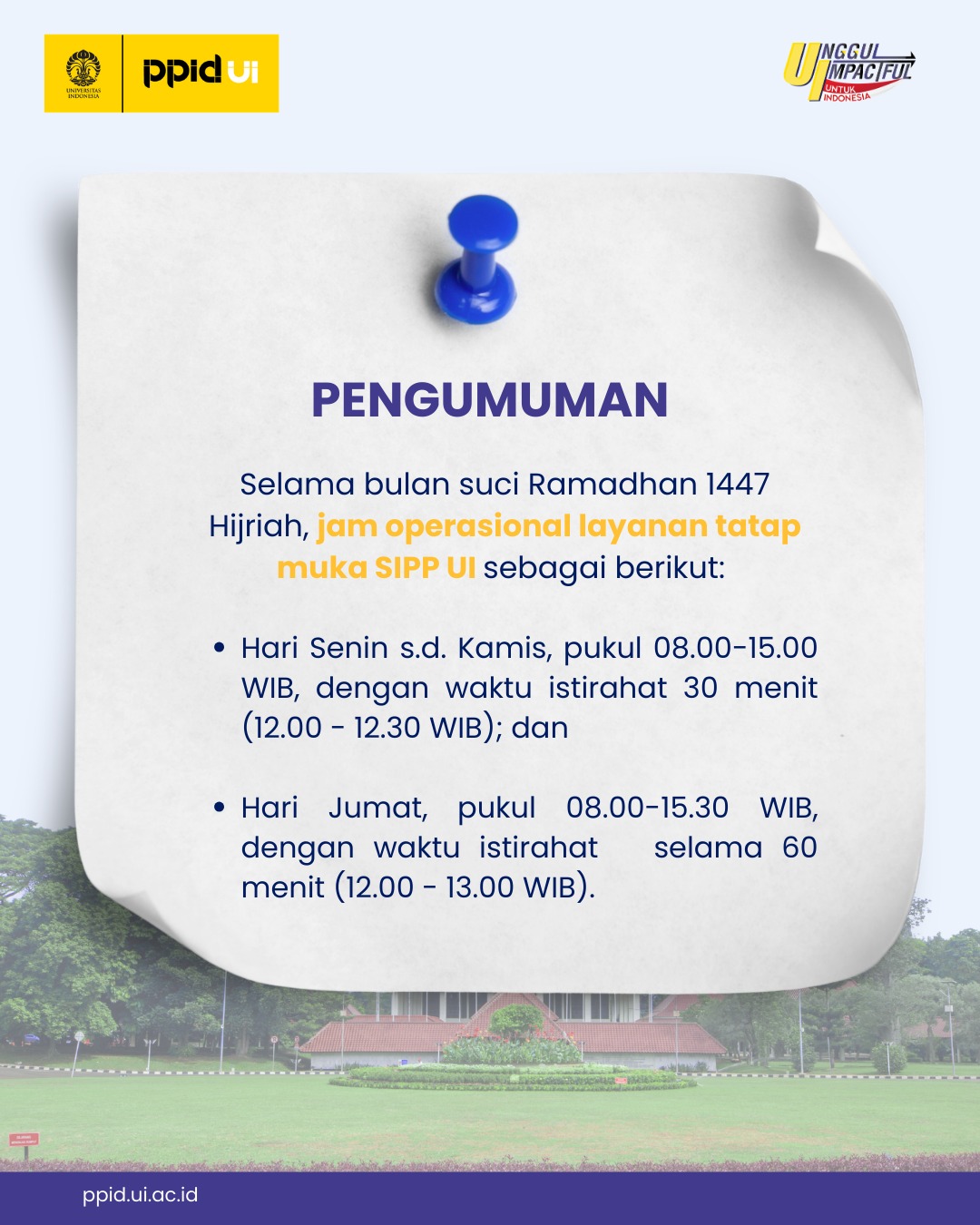 Dalam rangka bulan suci Ramadhan 1447 Hijriah, terdapat penyesuaian jam operasional layanan tatap muka SIPP UI sebagai berikut: