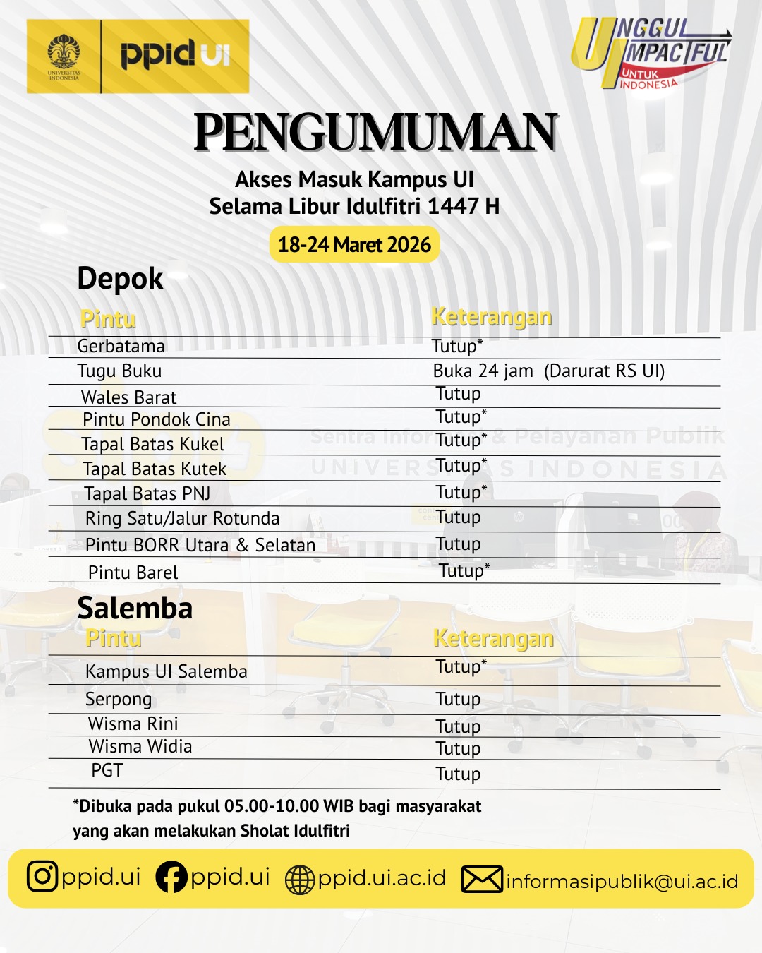 Dalam rangka libur nasional dan cuti bersama Hari Raya Nyepi serta Hari Raya Idulfitri, Universitas Indonesia akan melakukan pengaturan akses masuk kampus di area Depok dan Salemba pada 18–24 Maret 2026.